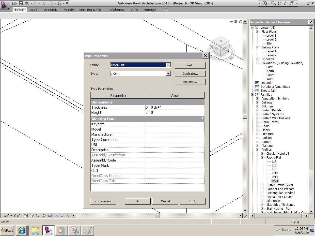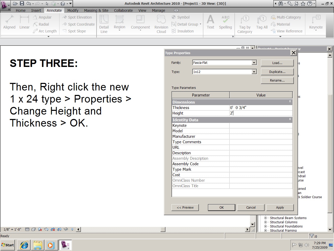 Then, Right clcik the new 1 x 24 type > Properties > Change Height and Thickness > OK."  see attachment 1..