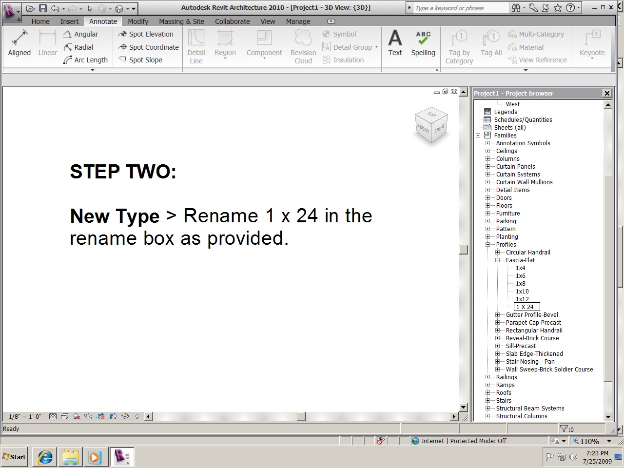 "Go to the project browser > profiles > right click 'fascia flat' > New Type > Rename 1 x 24 in the rename box as provided.