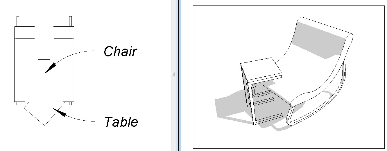 I thought the second image split screen of the table and chair made it pretty clear I was referring to two separate and independent 3-d families in a Revit project represented by masking regions (drawn within the family) in plan views.