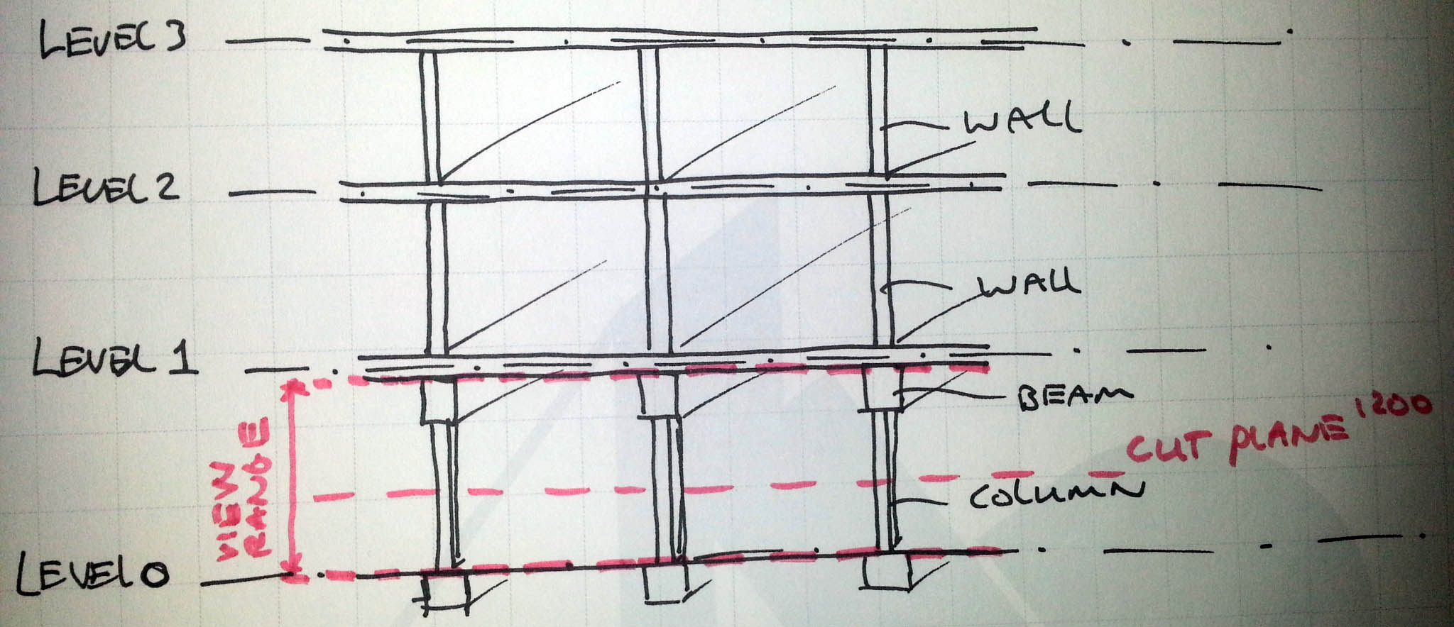 Then change the structural framing line type to dashed and line color to red, for easy to read. This way you can work on level 0, at the same time see the beams. After you placed walls, change cut plane to 1200, then you can see all doors and windows.