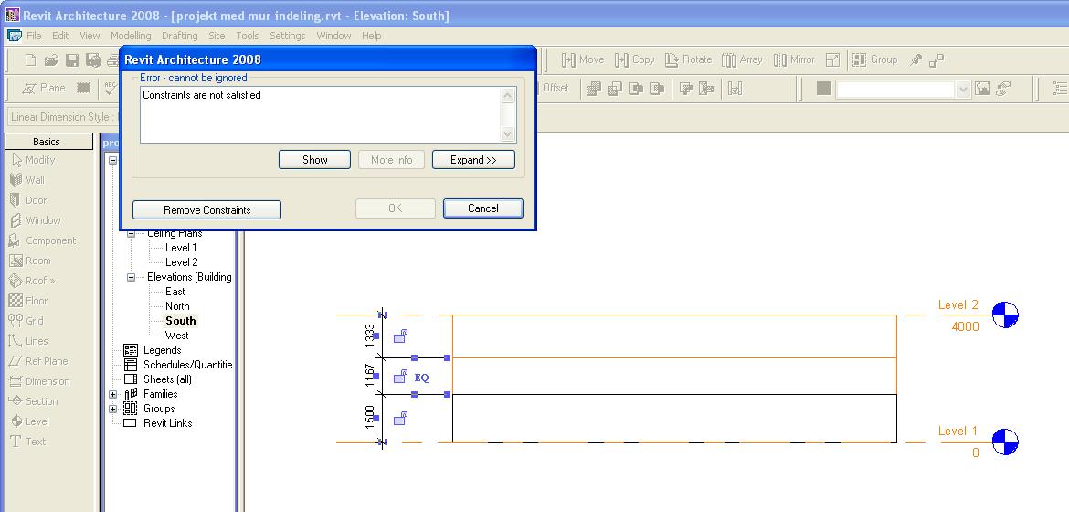 Hi I've run into a probem. I can easily split a wall in EQ sized sub walls in plan view (as many as a want), by using the dimension tool and EQ. I can also split a wall in elevation view (vertically) in 2 EQ sized subwalls. But I can't split a wall in 3 EQ sized wall in elevation. It pops up with an error - "constraints are not satified." Why am i only allowed to split a wall into 2 and not 3 EQ sized walls ? I've startet a blank project just to make sure i havent constraint anything that i shouldn't. Im going crazy!!! Really hobe somebody can explain it to me :O)