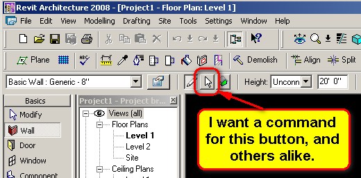 I need a Programing Guru. My question is beyond the simple commands they have shown. I want for example to make commands for the optional buttons within a command. Ex. Command ["WA" menu:"Modelling-Wall"] Otion within this command is: [(PICK LINES)] I want to know how to make a command for "pick wall" not just create wall. Is it possible to add more commands than they show. I know that the button (pick Wall) is a command. If not can I add an option after entering my command. Ex. ["WA" menu:"Modelling-Wall-Wall by Lines"] or something like this? Please, if you do not know the answer don't try convincing me of why I dont like using the mouse... I just don't. If there is no option to this then there isn't. I'd rather get the answer from someone who has tried many ways around this problem than someone who thinks they know what they are talking about. Thanks.