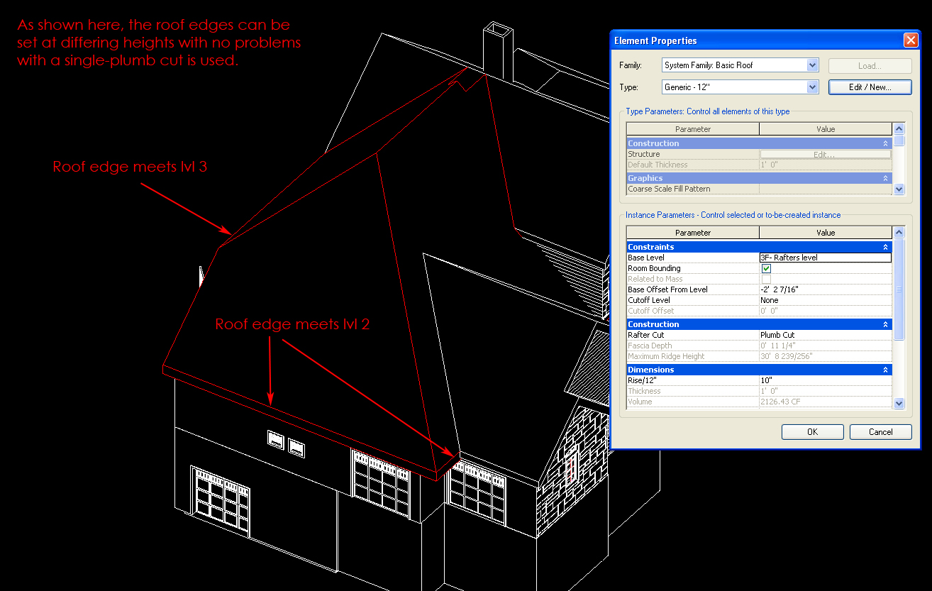 Afternoon all, I've been working on this roof problem all day, and I can't seem to figure it out. I've just changed my roof from single-plumb to double plumb cut, and added an 11 1/4" fascia. My roof is made in several parts, and all the parts had no trouble except for one. This part of the roof has two of its edges placed just below the 2nd level of my building, and the other two just below the 3rd level. They must be placed just below the level because of a construction detail, but that's umimportant. Previously, when the roof was single-plum cut, I had the roof set on level 3 and simply offset the other two edges (the needed to be on lvl 2) by -10', and the roof worked fine. However, Revit will not allow me to offset any edge once a double-plumb cut has been used. I had no trouble with this on other parts of the roof; I have edges on different levels with a double-plumb cut applied, and it worked fine. My question is this: Why is it that, on this portion of the roof, I'm not allowed to offset the edges of the roof when I use a double-plumb cut? I could offset the edges just fine when I used a single-plumb cut. I hope that the attached images help. If I can clarify anything, please don't hesitate to ask. I'm using Revit 2008. Any suggestions are welcome. Thank you all very much.