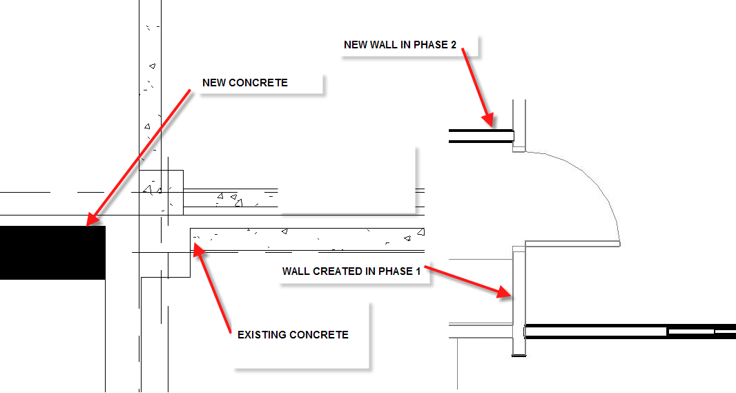 Typically we either have a limit of work or we are only keeping the structure of the building. The method for showing new/ old differs between the 2. When we keep the strucure only I use a solid black hatch for new concrete and a concrete pattern for exsiting walls. When you have a limit of work you can just draw a limit line. Also elements created on previous phases should show up grayed out in future phases. HTHNick