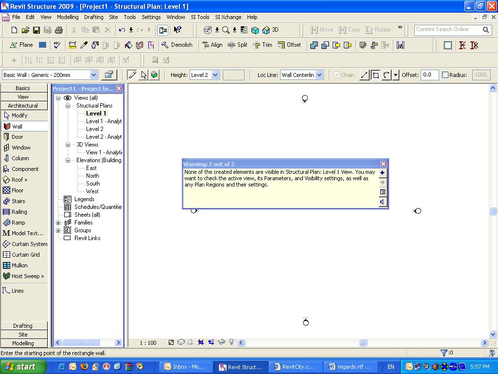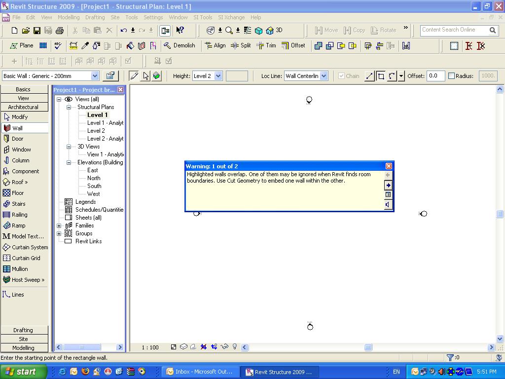 I am working in Revit Structure 2009, as I try to Draw a wall from the Architectural option of the Design Bar, I get a error which shows "Highlighted walls overlap. One of them may be ignored when Revit finds room boundaries. Use Cut Geometry to embed one wall within the other." & "None of the created elements are visible in Structural Plan: Level 1 View. You may want to check the active view, its Parameters, and Visibility settings, as well as any Plan Regions and their settings." please help its urgent for me, thanx in advance.