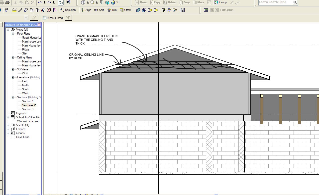 Revit 2009 Got a room with a 4 12 hyp roof. the top of wall is 6'2, but the ceiling is at 8' hi, so you have that little but of sloped roof at the peremeter of the room. how do you draw this? I tried the ceiling tool, it places line in the section, but no framed ceiling with thickness. do I try to build a floor 8' off the regular floor and try to connect the geometries?