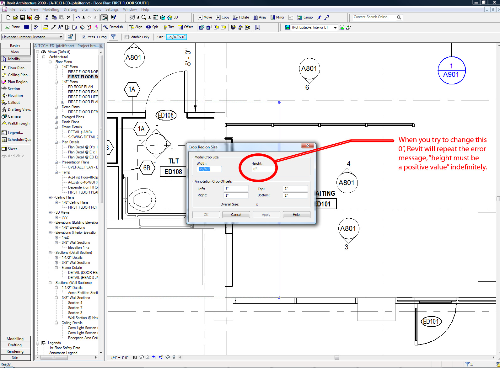 When I insert a new interior elevation tag, the default size is the room width x 0'-0". The view shows only the grids and level, as the height is 0. If I try to change the height, it results in an error message stating that the height needs to be a positive value. That message repeats indefinitely, requiring a task manager shutdown of revit. Has anyone else run into this problem? Any solutions?? (I attached screen shots with comments) Thank you in advance to anyone that takes the time to read this.