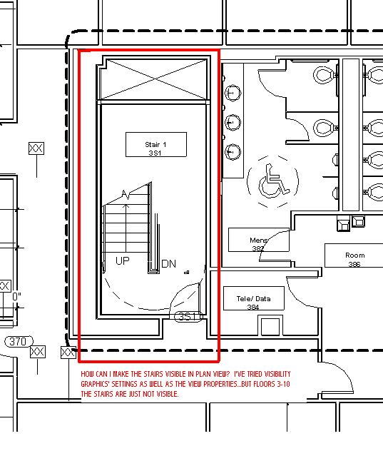 Hi, For some reason my left stairs will not show up in plan, although the are present in section view. I've tried playing around with the visibility settings in both the Visibility Graphics as well as View Properties, yet it still doesn't show up. How do I fix this problem? The right set is showing up fine. So I don't know what I could have done wrong. Anyone know of a solution? I've attached some images to make it easier to understand what I'm talking about. Thanks! Q
