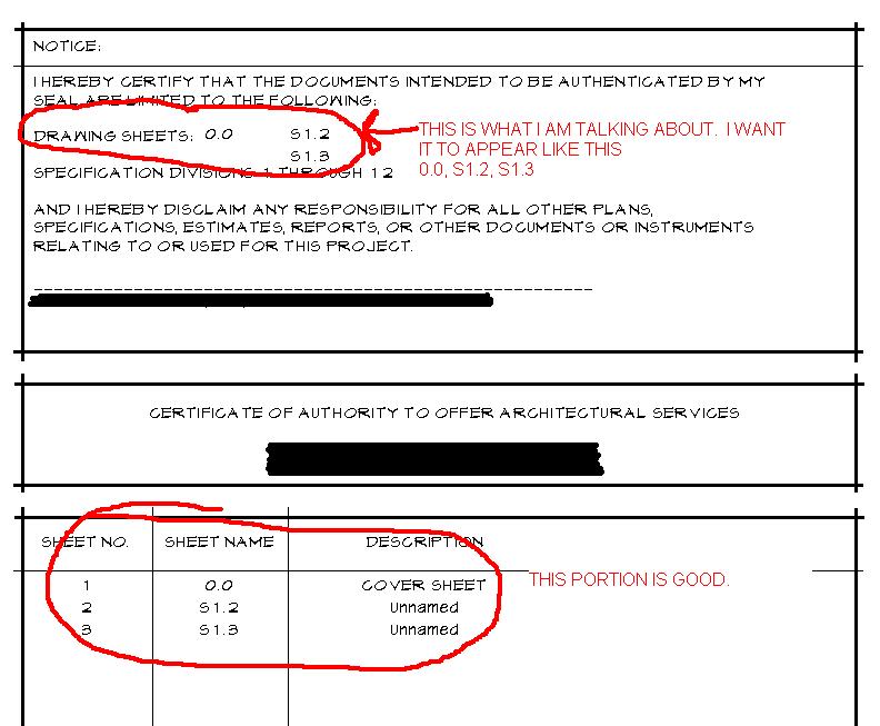 I am working on setting up my companies template and I am having a little problem with the drawing list. I have one that vertically lists the page number, drawing numer, and sheet title and it works great. The one I want to add just has the drawing number and is listing them horizontally untill it turns to the next line and so on. Just like a paragraph. I cannot seem to get it to work horizontally. Any advice?