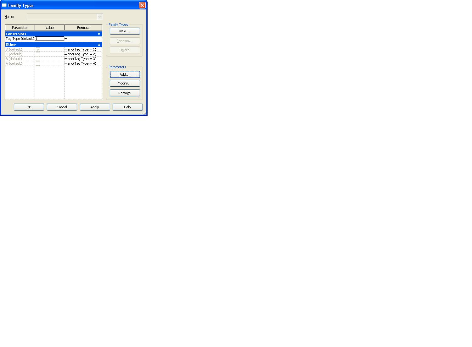 We are trying to create a tag family. We would like to choose a single component to be visible and the other components (3) to not be visible. e.g. A is on and B, C, and D are off B is on and A, C, D are off etc... We tried to use parameters to control the visibility of the components, but are having trouble making our formulas function in the way we anticipated them to. We have read extensively in the help menu and on other RevitCity threads. We are still unable to make this work. We created the components in a family (each containing a label and a line). Then we created yes/no parameters named A, B, C, and D. We assigned each component (label and line) to A, B, C, or D parameter. We attempted to enter formulas in the Family Types dialogue box. We were unsuccessful with our syntax. Any suggestions?