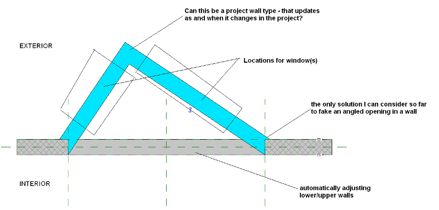 Previously, when working on our first project, we employed a window family type to build an angled bay window - in it were modelled the walls/cheeks, roof, base, trim panels & window - (all as extrusions) - all very neatly constrained and parametric. But towards the end of the project we found the family type restrictive; the opening cut was perpindicuar (where we wanted angled) late-in-the-day changes to adjacent wall construction weren't reflected in the walls/cheeks of the family type and the "window" had to be assigned a duplicate type mark, since we employed the same window unit in our elevations (on it's own) as we did in the bays. Today I have played with making a model group to see if we might replace the use of the old family; using walls, a floor object, roof & window - and as a singular instance it works fine; but we will be looking to employ this group 100+ times per project file; and trimming the upper/lower walls & joining geometry that many times seems a bit backward. Despite the numerous threads querying bay windows here, I've not found one suitable to our needs - and so would ask what method you do/would employ (nested, shared, in-place, group, etc?) to have something (schedulable) to match the very simple attached plan. Thanks in advance.