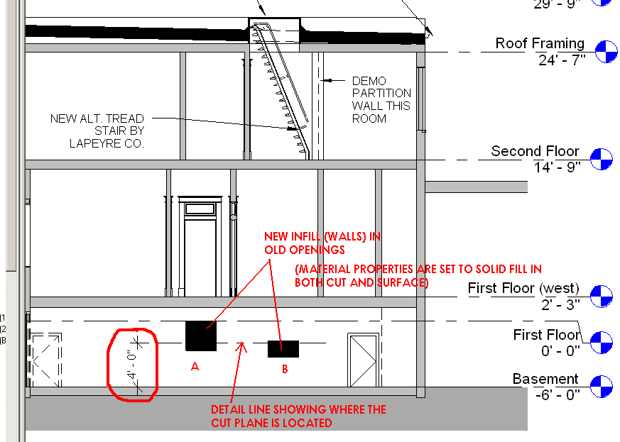 The attached images show a common problem I have with VIEW RANGE. Two similar elements are cut by the cut plane, yet they display differently. I don't understand why. Both elements are of the same material. The material is set to have solid fill (black) for both the surface and cut pattern. Version: Revit Architecture 2008 Interestingly, infill element "B" will display with the proper solid fill (black) cut pattern when "Bottom" and "Level" are changed to "Unlimited". It seems like the logical thing here would be that if the cut plane is set to pass through the element, it should display with the proper cut pattern.