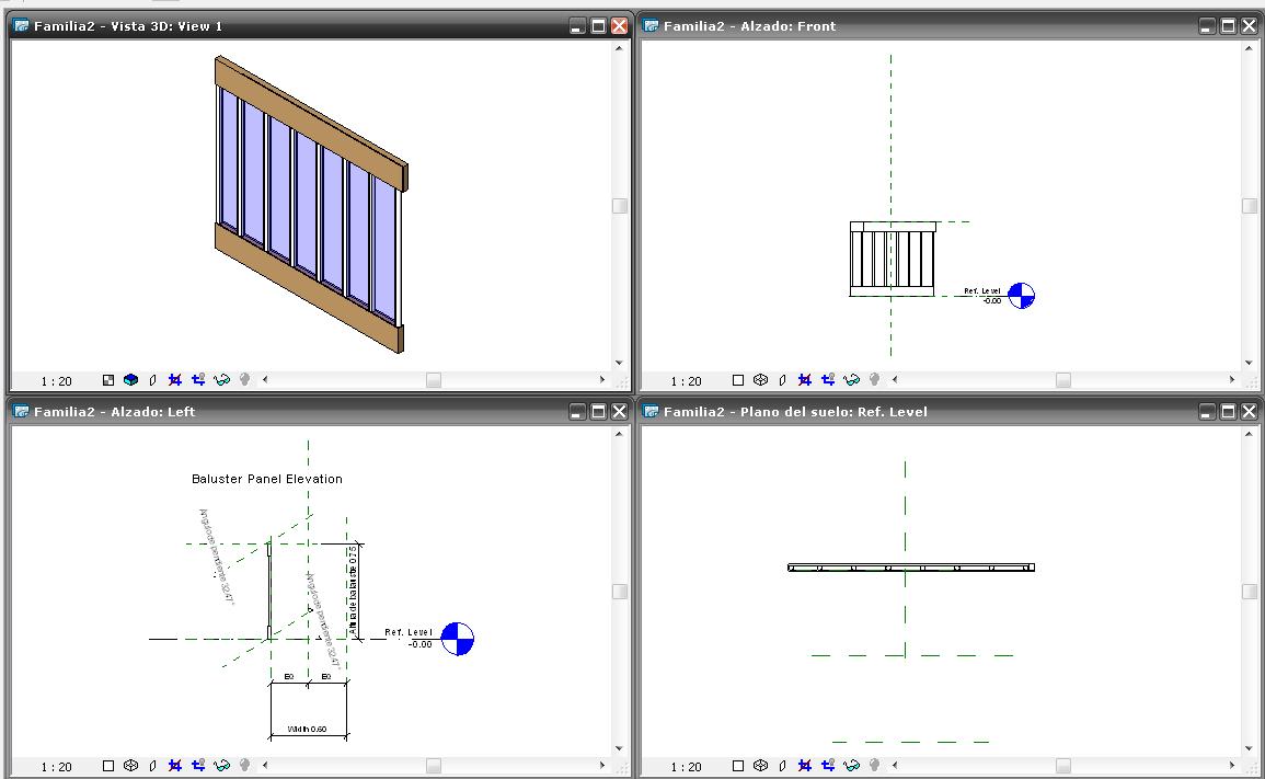 I'm completely noob to creating families. In fact, I'm reading the Revit's user guides and trying to do the tutorials witht he trianing files. As I could create a normal baluster and used it in a project, I thought it would be difficult a panel. I used the file Metric Baluster Panel.rfa to create what I did. I guess that one is the correct. So I started sketching the model (panels) and then I imported the family and used it. But you can see what happened (problem). Then I thought It would be fixed If I rotated the model (panels 2). But no! Any ideas what I'm doing wrong? Thanks a lot! (Using RAC0