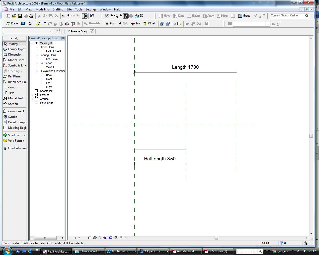 I am getting this all wrong - maybe for clarification I'll list my step and perhaps you guys can point out where I'm going wrong with this? 1: launch RevArch2009 2: New family: Generic model 3: drawing 2 model lines 4: make temp dimension from line A permanent 5: adding parameter to dimension of line A - selecting family parameter, name: FullLength, type of parameter: predefined as "Length", selecting "instance", and "group parameter under" = "other" 6: at this point line A cannot be edited graphically by dragging its end vertices 7: make temp dimension from line B permanent 8: adding parameter to dimension of line B using same settings as mentioned in step 5 above, but usung name "HalfLength" 9: opening up dialog "family types" 10: under formula for parameter "HalfLength" set to "FullLength / 2" 11: now line B is set to half the length of line A as planned 12: BUT neither line (intention was line A) can be edited graphically by pulling its vertices, which was the point of this exercise so what am I doing wrong? do I need to save or load the family into a project file? hlp pls...