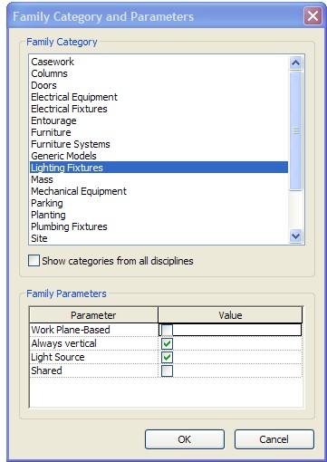 I appreciate your help, even though you are absolutely incorrect. At least as far as what I'm looking at on my screen.  Under Settings-Family Category and Parameters, there are only 3 parameters available for Light Fixtures. Light Source, Part Type and Shared. MEP09 is the software version I'm using. Thanks again.