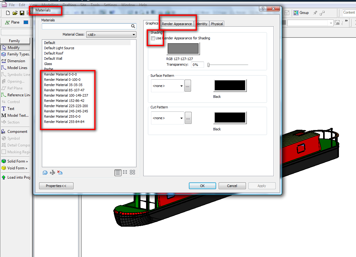 Ok I've been using Revit for a week now and have started to get to grips with using it but I am working on a project where I need to place canal boats within the model for rendering. I've had a look at the tutorials and still am a bit lost on how the material works when importing a sketchup model in to revit. the fact that when im in 3D mode I can see the colours on the boat but when I render it comes out grey. The model Im trying to use is http://sketchup.google.com/3dwarehouse/details?mid=94d769a9b6bec72e7a5354a0d63070&prevstart=0 It would be simple if there was a Revit model allready out there that I could use but I have failed to find one. I even looked at buying one but still couldn't find one. If anybody could explain to me in very basic terms how I can use this sketchup model in revit with revit materials it would be much appreciated. Sorry to be a bother but really couldn't get my head around the guides that I was able to find. Thanks.