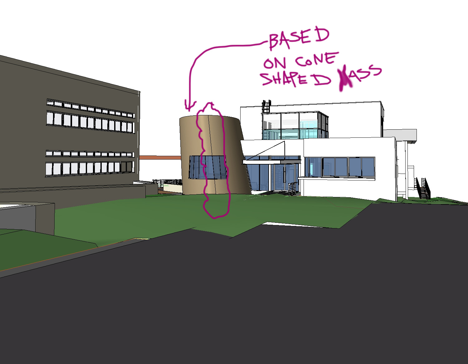 blend extruded- two elipses well- yeha..i am pretty sure they were tangents. but in actual fact- it was done some time back.. i keep having to take off the lines with invisible lines tool- but its pretty late in the project to cahnge the modeling of the mass... anwyays- not sure yet hwo our contractor with build this..might just change the design to a square based on cost implications in the end... but thanks for the help.. will try for tetign ground next time
