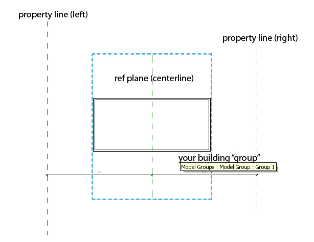 Draw a reference plane at the "centerline" of your building (parallel to the property lines). Now, select the reference plane and EVERYTHING on your building (pull a selection box around it all) and group them together. Now pull a running dimension from the left property line, to the centerline reference plane, to the right property line. Click the EQ button that is presented after placing the dimension. This will center the building. Now, simply "ungroup" the group you made. And, presto! Your building is centered...