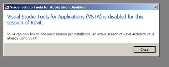 I cant run two sessions of Revit 2010 as I use to do with 2009? Gives me this error: Visual Studio Tools for Applications (VSTA) is disabled for this session of REVIT VSTA can only link to one Revit Session per installation.An active session of Revit Architecture is already using VSTA I mean com_on this is really crazy!! So now how am I suppose to open two sessions at once? I use to Render on one while working on other and does this mean I will have to buy two PC's and two licenses if I want to run more than one session? See the print screen error attached