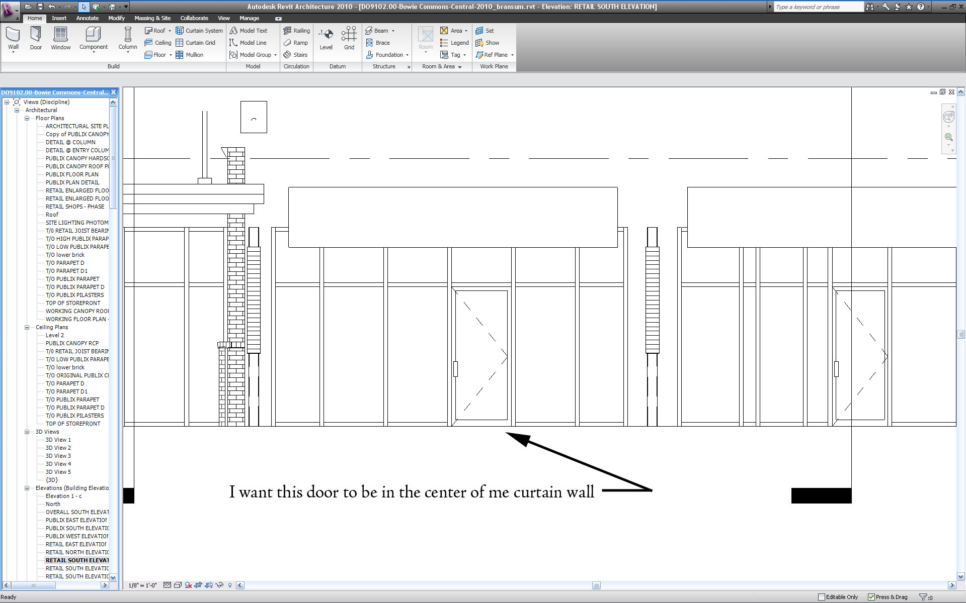 Well I guess I’m not making myself clear. This is my fault. What I want is my door to be in the center of my 17’-6” distance (the length of the curtain wall). I want the mullions to all be 3’ 2-1/2” form each other with the exception on the two at each end. They will be a shorter distance of course. When I say I told revit to “center the curtain wall” I mean I clicked the appropriate menu or check box or radio button. As you should be able to see in the image that I posted the curtain wall is centered. All the mullions are 3’ 2-1/2” apart expect the two end ones and they are a little shorter in order for the curtain wall to be centered, but my door is not centered. It is a curtain wall panel, I followed the correct procedure for placing a door in a curtain wall. WWHub wrote “you have to turn the element properties to independent.” This sounds like what I need to rearrange the millions so my door is centered, but I can’t find where I tell revit this. Of course when I say “tell revit” I mean I can’t find an appropriate menu or check box or radio button in order to achieve this.