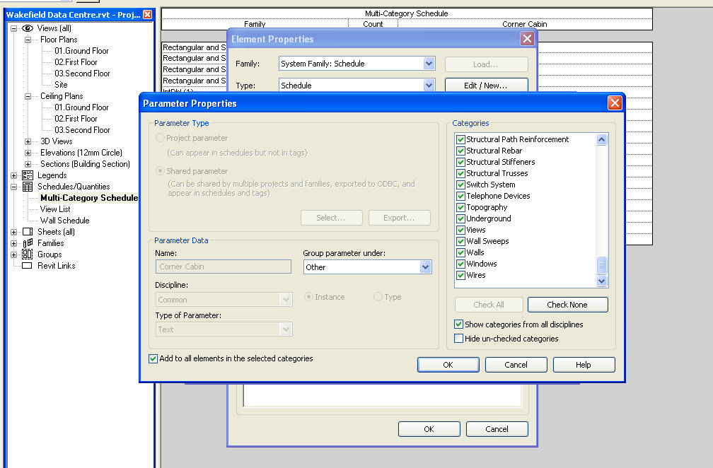 Hi I am getting little success with multi-categories schedule but need some expert advice. See attached snapshop for schedule. Schedule now showing all columns, doors & windows. The items missing from schedule are walls, floor & ceilings. See attached snapshot 2 for my shared parameter properties and please advice me something. Thanks in advance