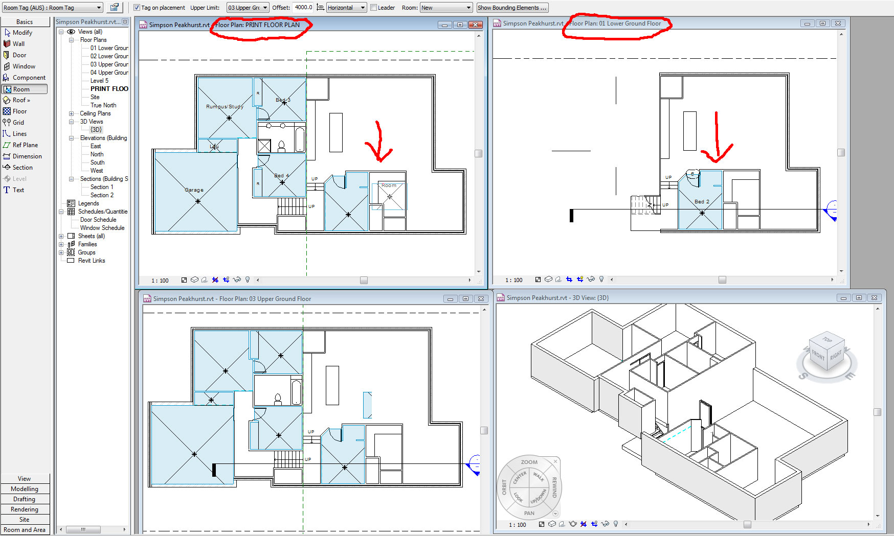 Thanks for your replies. I have tried what you suggested but it is still not working yet. I have attached some images to help: Image 1 - When on the PRINT view, and I select room, it shows the bounding area but not the tag name. On the lower plan (the actual plan without a plan region), it shows the room tage plus I am hovering over the next room and it finds it to tag. Image 2 - Shows what happens in the print view when trying to tag that same room, it doesnt find any bounding areas. Image 3 - Shows the bounding areas which is obviously why it cant find it in Print view cause there are no bounding areas. 'If you are unable to 'tag' the room in the print view you may want to check the instance properties of the room itself. More specifically the room limits. Room: Upper Limit, Limit Offset, Base Offset.' Could you please explain a little what you mean by this. I have adjusted the 'upper limit' icons you can see in images 1 & 2 but it changes nothing, is that what you meant? Thanks again!