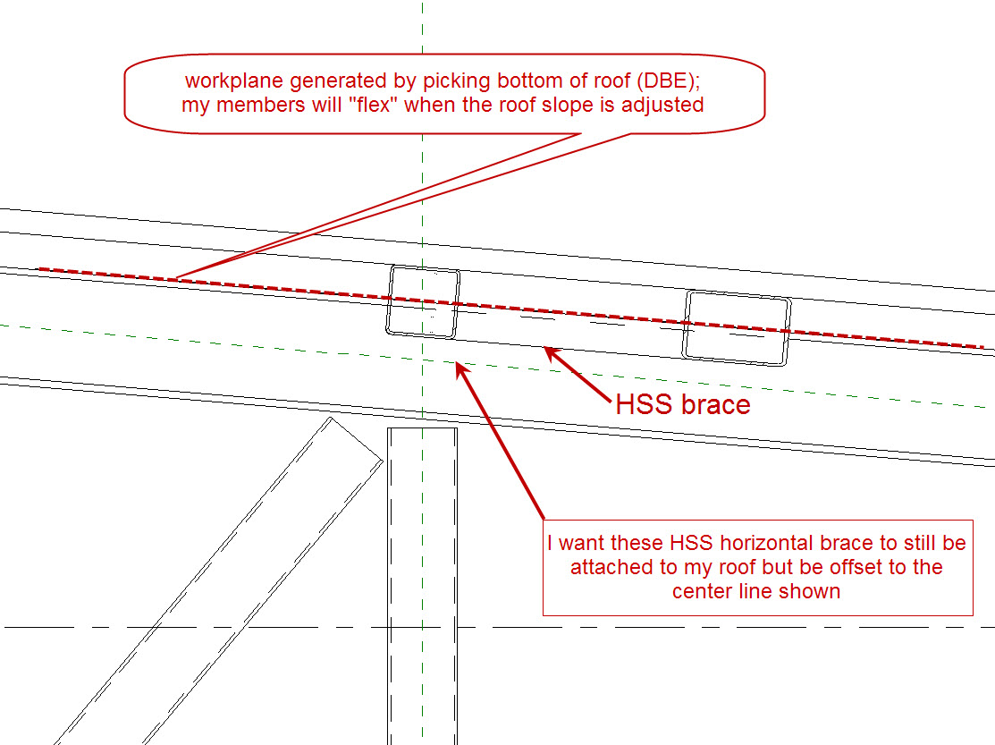 Thanks for replying, To answer you question, these are for horizontal braces (but could be for anything you want to flex with the roof). The procedure I used is as follows: 1. Model roof (by the way, I have heard using floors is a good idea...any particular reasons?) 2. Cut a section through the roof. 3. Set the workplane with pick lines 4. Select the bottom of roof -this will promt me to choose a view to associate plane with...i chose my roof plan 5. Now I am in the PLAN but my workplane is set to the bottom of deck. I can place members that are attached and associated to the roof. If I change my roof slope, my members will also change slope. But I need the horizontal bracing and the nominal half chord depth (centered) 6. This would also be the case witha sloped joist roof I guess. I apreciate your time.