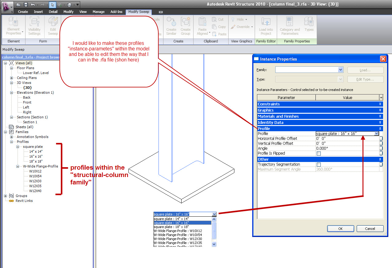 I agree i was confusing. What i was hoping for here was a "super-member" of sorts. Instead of placing a W10x33 column in the model, a structural column could be placed. Then later, column could be edited in its properties and its section size could be chosen from in that screen (by selecting a different section sizes profile that is tied to the family's sweep/path functions), then select the plate profile from that screen. Here is a photo (attached), a bit of experimenting and everything, but this was the first thing I was trying. I was more or less tying to see if this could be done? Your posts have been very informative and I appreciate you replying to me. GReg