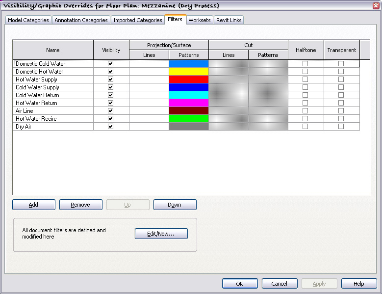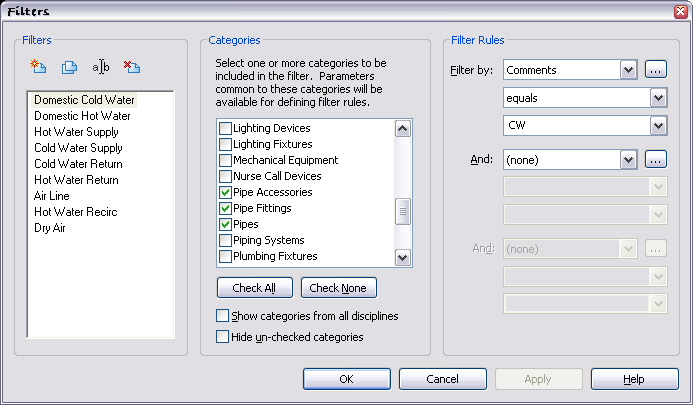 I usaully create filters with different colors for each type of system. Then I just set the filter to read the COMMENTS property of all the families in the pipe catagory. Then in the view(s) I add the filters in the visibility / graphics dialog and then just type in the comments property the abbreviation for the system. See the attacched images for examples. HTH Edited on: Fri, Nov 20, 2009 at 11:32:31 AMEdited on: Fri, Nov 20, 2009 at 11:32:56 AM