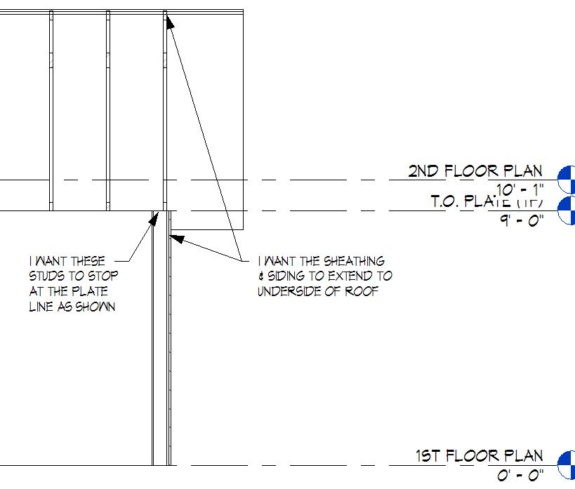 Hello all, I'm having issues with gable walls/roofs. My walls are set up with all the appropriate layers like a house would have (studs, gyp. bd. sheathing and siding). I want my studs to stop at my top of plate level, but my sheathing/siding should continue up to the underside of my roof. I unlocked those layers so they can extend beyond the studs. But I dont know how to have the sheathing/siding layers terminate under the roof. The only way I have figured out how to do it is let them extend beyond the ridge a bit and then do a void (which is a pain). Is there an easier way? I guess it wouldn't matter except that when you go to cut a section the geometry is completely wrong. If you join the wall to the roof it joins the entire wall, not just the sheathing and siding like I want. The way that I have been making it work is by making the sheathing/siding a separate wall, which is also another extra step. Any help would be greatly appreciated. See attached images...