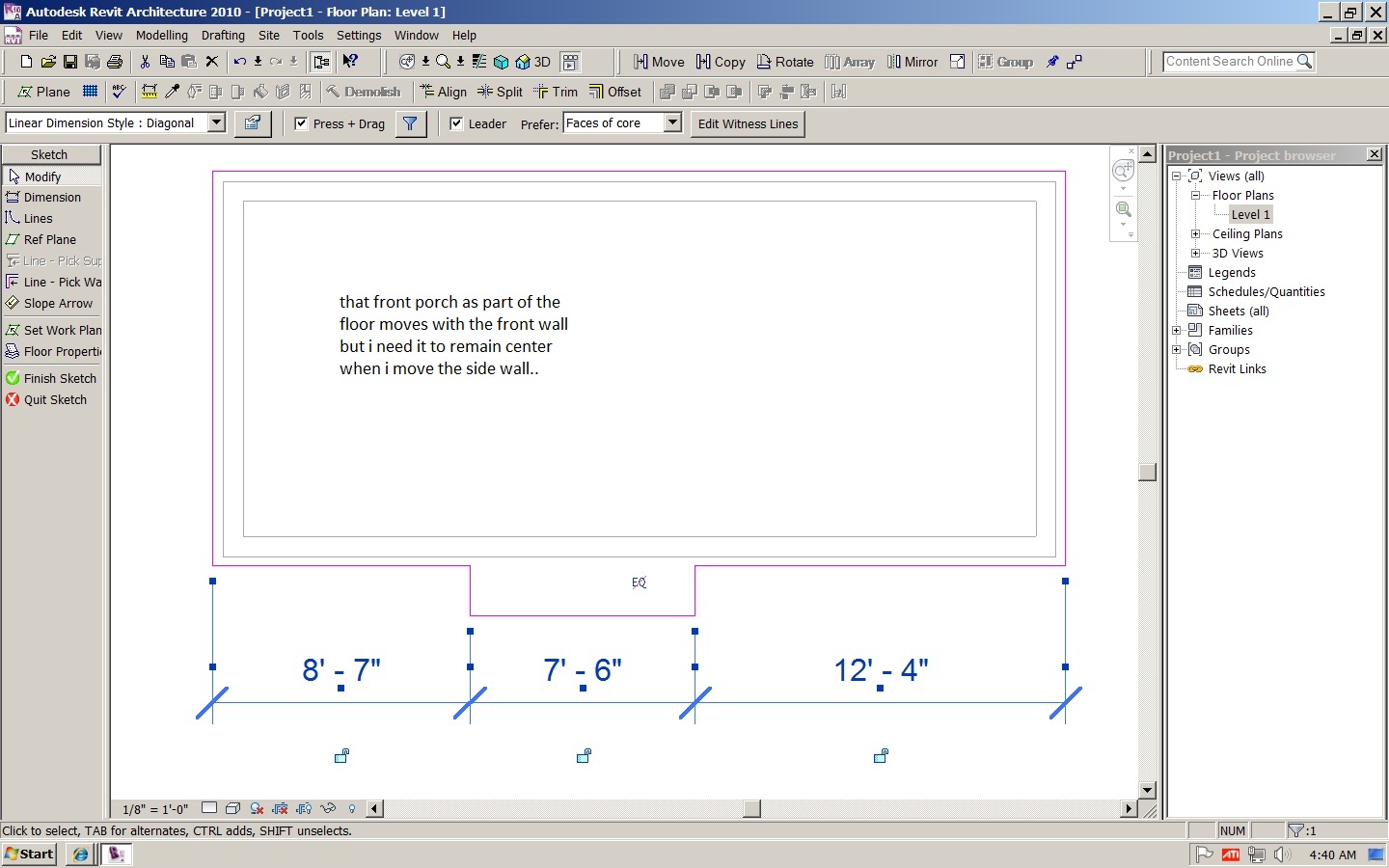 "when you created the floor did you associate it to the wall?" that's why i said the floor moves with the walls.. if that's what you mean by "associate".. "What are your dimensions really too?" that's what i'm asking- what do i need to dimension to for the front porch part of the floor to remain center when i move one of the side walls.. in other words- all of the floor (including the porch) move with the moving of any four walls- BUT the porch does not stay centered when i move a side wall.. how can i make it stay centered when i move a side wall?