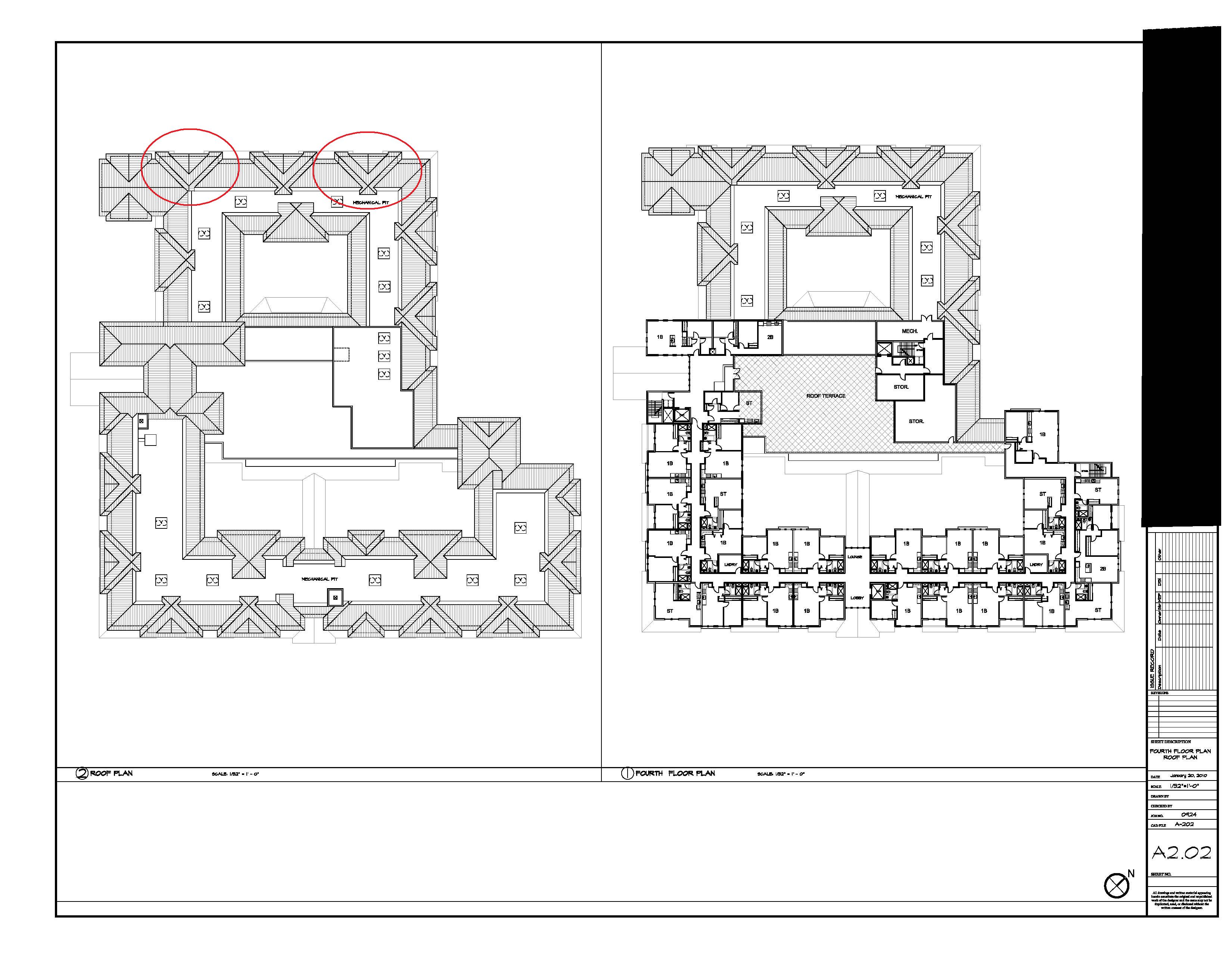 We are currently working on a large senior care facility. We started the drawings in AutoCAD and are now transferring that information and building the model in Revit. The roofs in particular are giving me some hiccups. The attached jpgs are exports from CAD. They show the roof plan and elevations. The pdf is my attempt at trying to build part of the roof. The part that I cannot figure out is the gable that comes over the ridge into the mechanical pit (as illustrated in A-202 but not in P4 Roof Plan, see below). Also, I think that I need to make two roofs to accurately model the gable over the him (see A-202 on the north facade and 1/A302). I am just trying to block everything out right now and will be adding the detail later. Thanks for any assistance.