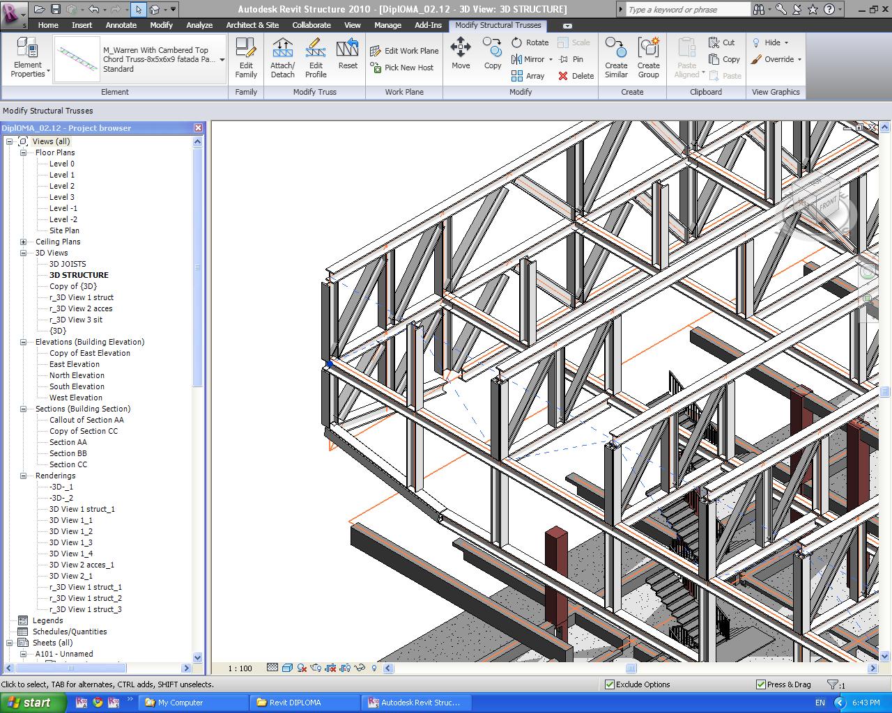 I have created a truss in Revit Structure 2010 and after I edited it by adding some vertical elements, the diagonal webs disappeared in 3d view. I cannot see them in both Revit Structure and Revit Architecture 2010... I have removed related warning, they ask me to make a wall bearing... Any ideas? The blue highlighted element is the truss. the wall is hidden is this view, but even if I remove it nothing changes.