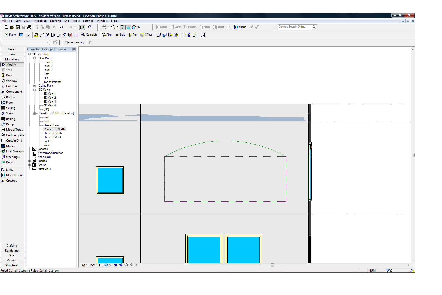 So I am trying to carve a arched top storefront window into an existing wall. I draw some lines on the wall to match the appropriate outline. Then I go to curtain system by line choose my lines and the curtain wall is created minus my arch. It squares the whole thing up. The Geometry shows the arch but the actual glass or "storefront" is not there. Also when attempting to attach mullions to the first arch they too refuse to go into the arch and are placed 90 degrees to each other. So I can't get the mullions to arch either. Any help would be appreciated. Thanks Note: In the image the dashed line is the created curtain wall having excluded the arch.