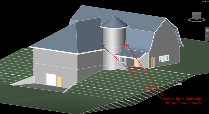 Greetings, New here and new to Revit, but I have been around the Architectural software block several times. I finally committed to doing a project entirely in Revit and I am thrilled with the software so far and looking forward to spending a lot more time in this forum. Without further gilding, however, I have gotten snagged by an issue in my project that I hope I can find some help with. As seen in the attached picture I have a round tower that is inset into an L shaped barn. Part of the barn has a gambrel roof that I built by extrusion due to the flared eaves. The other part has a hipped roof that is joined to the gambrel. Both roofs currently intersect and run through the tower. I can cut a vertical opening in either roof to block out the tower mass, but when I cut the opening in the gambrel roof I get the error that the hipped roof no longer intersects part of it and can not be joined. I get the same error if I try to cut a shaft opening through both roofs, or try and edit the footprint of the hipped roof and then join to the cut gambrel. I'm running out of ideas on how to handle this and any suggestions would be appreciated, especially ones that work. I'm running Revit 2010, thanks in advance for the help.
