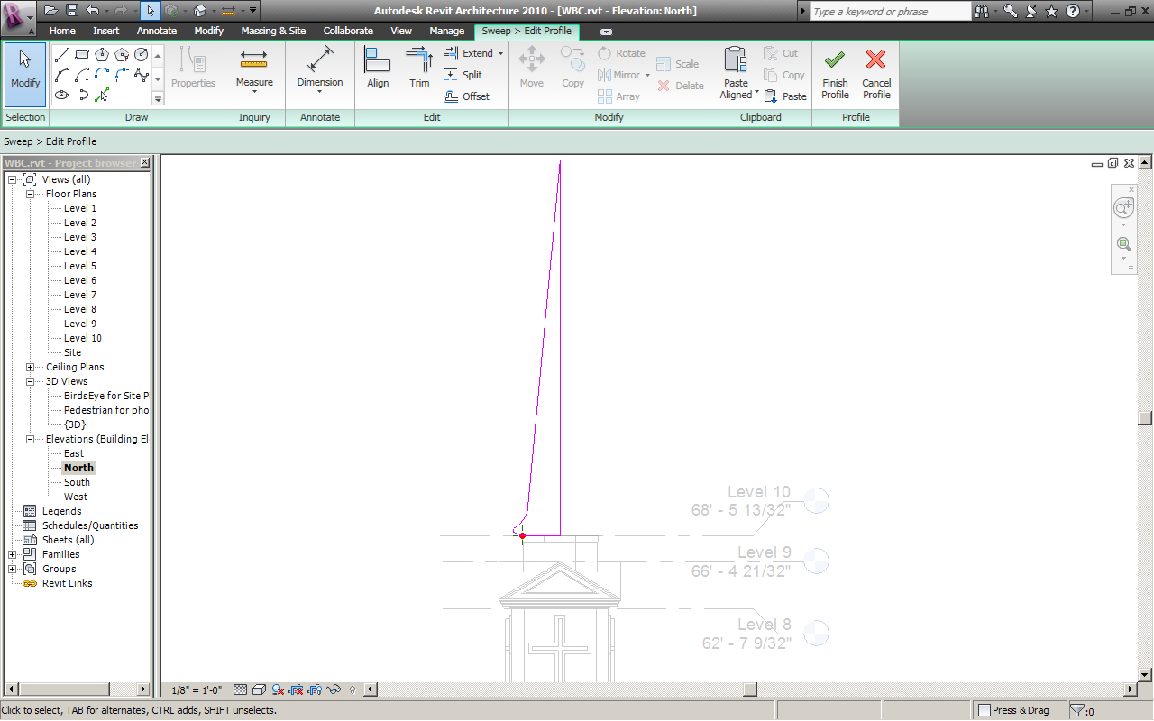 Hi all, I am having some problems trying to create a Steeple by using the Sweep tool using Revit 2010. I selected create new component, then selected roof category (only because I didn't know which one to use), then selected Sweep under Solid. Attached, you will see an image of my path, as well as my profile of the steeple. When I click finish sweep, Revit gives me an error message saying cannot create sweep. Does anyone have any idea why it won't let me? I have done numerous sweeps, and can usually figure out what the problem is, but with this one I am stumped. Any advice would be very much appreciated! Thanks!