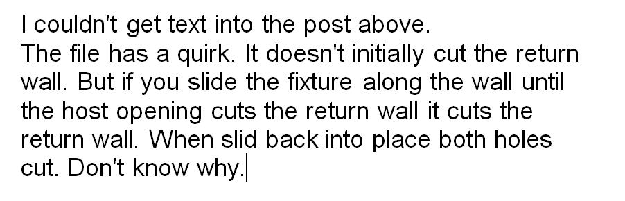 I couldn't get text into the post above. The file has a quirk. It doesn't initially cut the return wall. But if you slide the fixture along the wall until the host opening cuts the return wall it cuts the return wall. When slid back into place both holes cut. Don't know why.