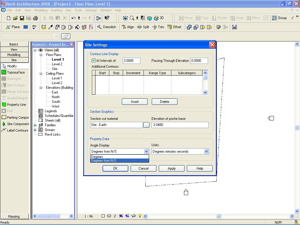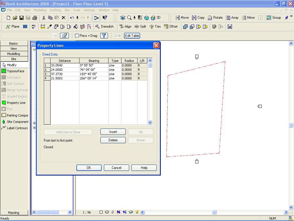 Hi all, I'm redrawing a current house plan on Revit Architecture 2009, but I have encountered some problems with my property line. My problem is that the bearings and distances I have been given seem to disagree with Revit. When I try to make the property line using the distance and bearings table on the larger bearings it says that the bearing has to be between 0* and 90*. So my question is how do I draw this property line to scale. The Bearings and distances which I have are: (* = degrees) 33.054m 0* 55' 50" 24.000m 76* 09' 00" 37.373m 183* 40' 05" 21.500m 266* 00' 20" I'm also not sure on the direction of the lines but when closed they form a rectangle. I hope this makes sense, but if it doesn't i'll try my best to describe it better to you and attach a scan of the original plan when I have the right equipment. Thanks, Jake