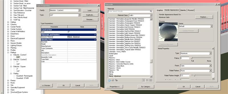Sorry, i thought you are talking about those Black rails, in the first post you have "Metal - Aluminium" in the last post you have "kawneer - Anodiz", now my question is: is this the same material (texture) in Render Appearence? Ohhh sorry, that last picture is about Rails and not the balusters....