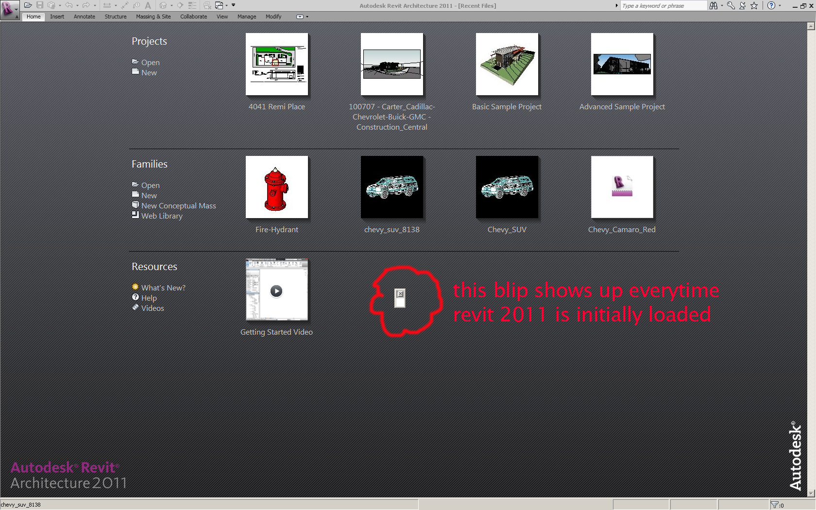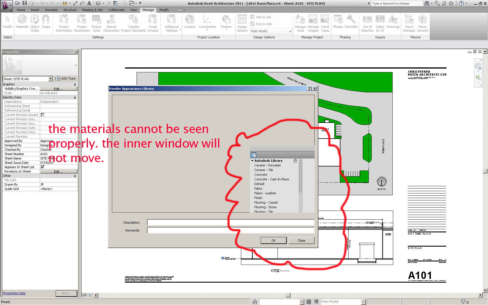 Hi Everyone, I've searched the forum for answers and could not find anything similar to my problem. I currently have a couple of issues with R. Arch. 2011. Hardware acceleration and Anti-Aliasing is off. 1st: I get this blip/tiny window everytime I load Revit 2011. See attached image. What the hell is that and how can you get rid of it? Very annoying! 2nd: I cannot properly view materials in the Render Appearance Library.The window is off and shows up at the bottom right of the Render App. Library dialogue window. See attached image. I have a XP Pro x64 SP2, Core 2 Extreme x9650 3.0 GHz with 6GB RAM, ATI FireGL V3400 driver version 8.583 Help!