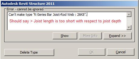 Anyone who has played around with RST has seen this error: Can't make type "K-Series Bar Joist-Rod Web : 26K8". (see image below) This happens with wood web joists as well as steel web joists. What this error should say is 'Joist length is too short to retain the correct webbing". This is caused because the span of the joist is too short in comparison to the joist depth. The way the families are made there needs to be a minimum amount of web 'zig zag' at each end of the joist and if theres not enough room to do so you get the error. This can be fixed by making the joist depth less deep ie: change from a 26" dp joist to 14" etc. but there is no know workaround that I know of to make the joist length really short and still retain the webbing.