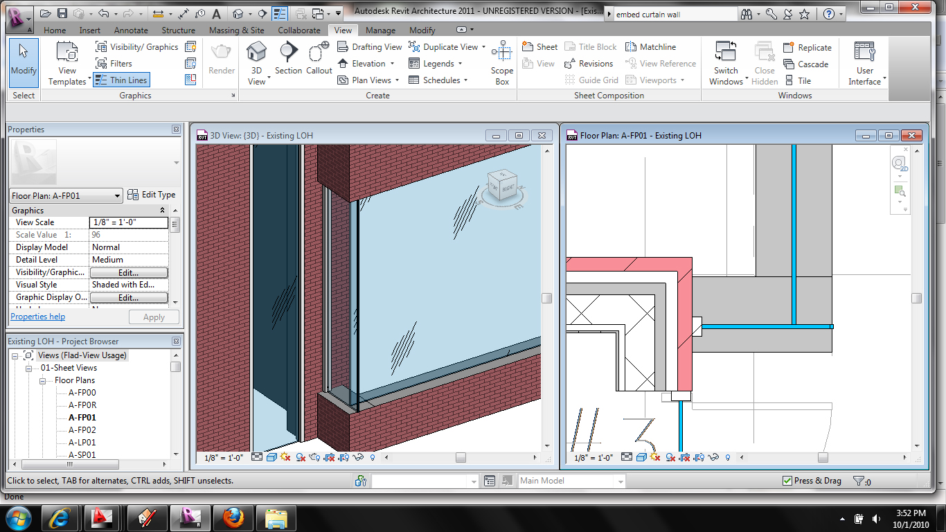 Well, I guess I have another issue. I tried the enbedded curtain wall and it works pretty good except for the corners. Here are two attached images showing the problems I am having. The curtain wall does not cut through the brick wall at the corner? Only when I extend the curtain wall through the entire length of the wall does it work. which is shown in the second image.The problem with tihs is that the curtain wall is no longer correct. Any suggestions?