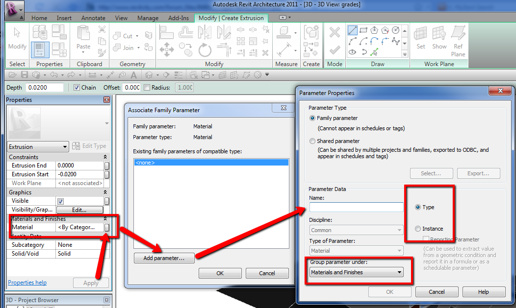 So, I got the void extrusion to cut off the sweep, but I did not understand the add parameter stuff for the roof sweep. As you can see in the attached rendering, I did apply a concrete material to the roof sweep, but I tried adding a parameter ot the sweep and the options didn't look exactly like yours. I'm using 2010 though. Are you using 2011. Yours said Extrusion Properties, but I'm trying to add material properties to a sweep. Anyway, I am just trying to apply material to the faces. I want the slanted part of the sweep to have that redish paint look, and the fascia to be concrete and the top of the sweep just to be white. I tried painting the faces(that's how I painted the slanted wall and floor portion shown in red). But, it didn't work. Also, how do i get the wall and roof sweep geometry to clean up nicely? They look clean in the rendering, but all choppy in the model. Thanks for your help.