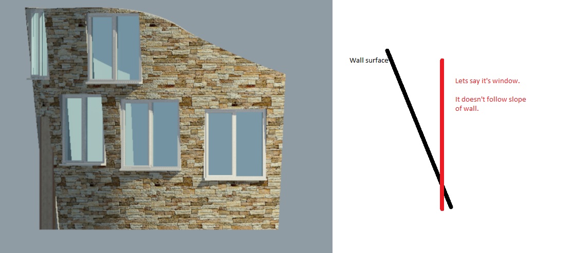 Sorry if i didn't explain enough. English is my second language and currently i'm using polish version of Revit so i might have "translated" divided badly however i thought it was same in english version. Anyway.. i give more pictures. Dividing surface- Well there is wall.. my sloped and curved wall - i want to make sections of different materials on the surface of wall.. same as shown on simple wall in picture. Sloped walls and windows.. on picture i uploaded it's maybe not that visible but was on one i tried before. Lets say i want to put glass (window) on wall...if question one is answered i wont have to put windows but id like to know anyway. Wall is sloped and window doesn't follow slope of the wall.. and in end result window is vertical and my wall isn't. that makes holes in wall where wall doens't match window or other way round.. on picture it isn't so visible but made a paint representation what i mean. So how to make window follow slope of wall if it's possible?. if something is still not clear please ask to verify ...