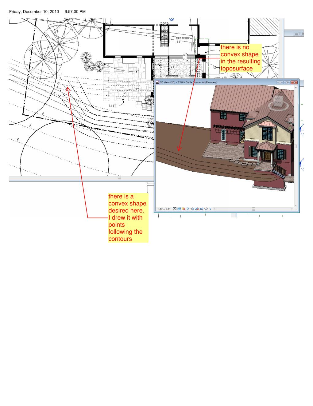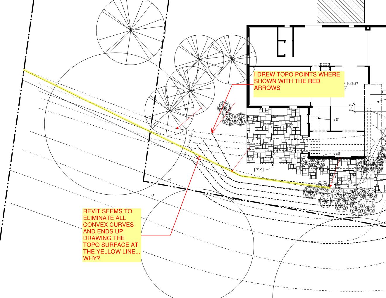 I think i have plenty of points to describe the convex shape. I also notice that the topo surfaces don't triangulate between elvations, they are just drawn as planes. is there a revit setting?... see pix attached. Really frustrating. I draw the points and whenever they are concave, they are ignored when drawing the topography.