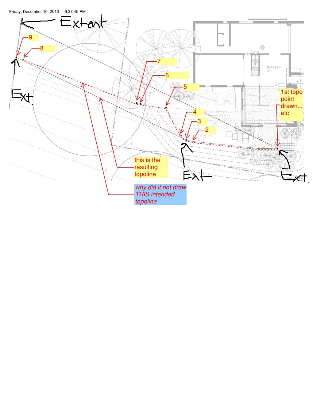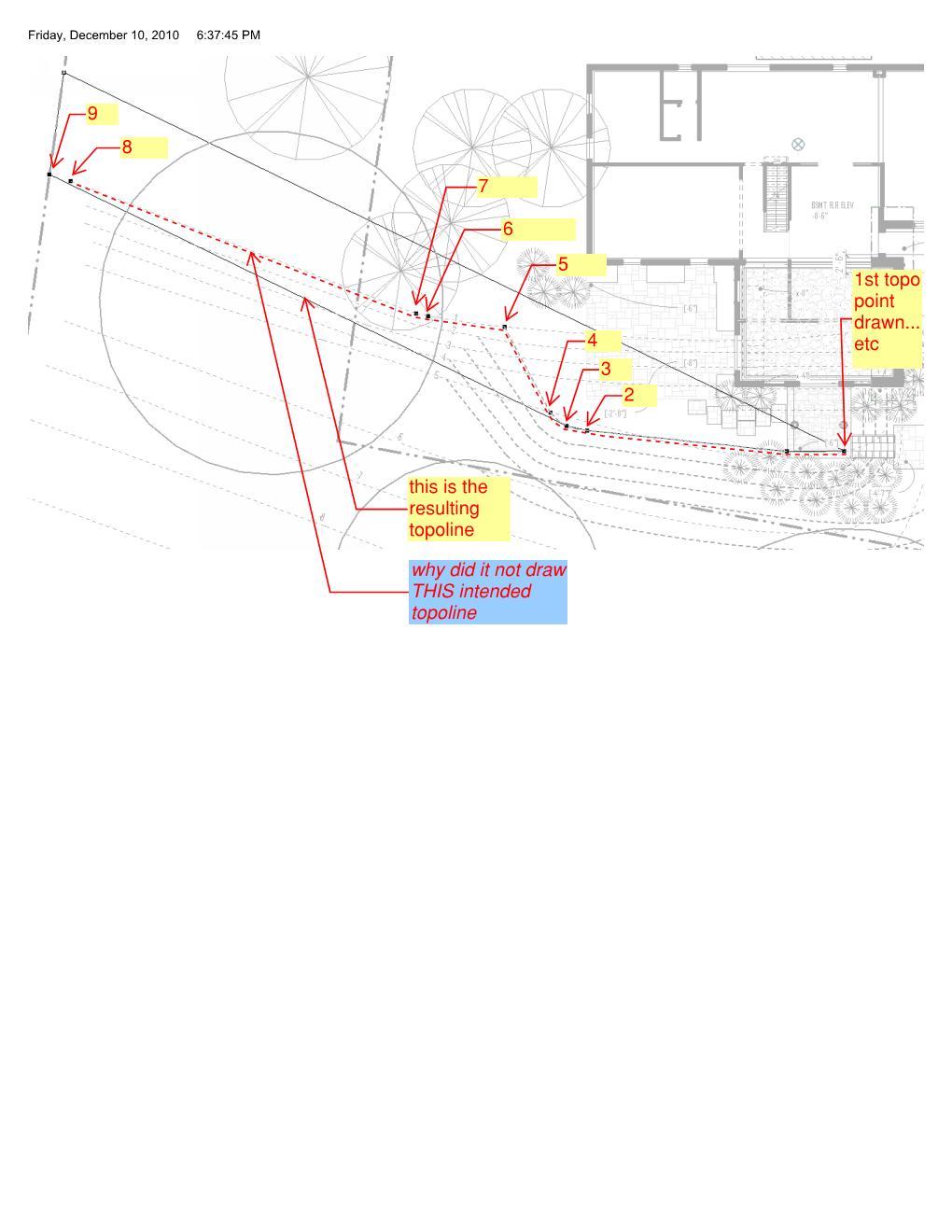 the depth top and bottom are both correct to fully show the topo line elevation i am drawing. it behaves like a rubberband and wont follow the points drawn. See attached.