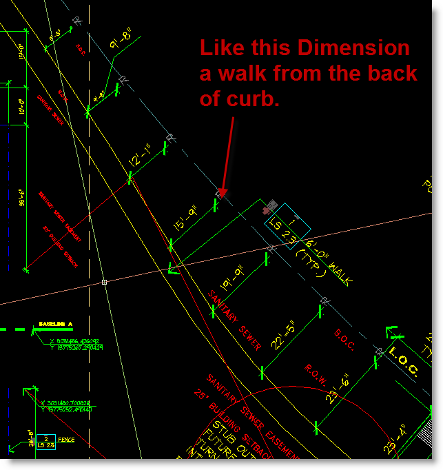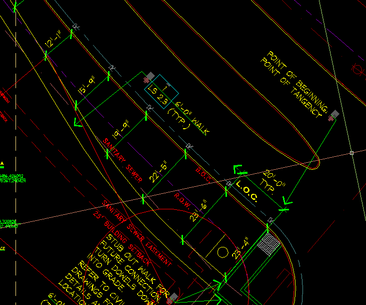 Yes, the xref was missing so it didn't show the back of curb, and you do not see the some of P.O.T (Point of tangency) and P.O.B (Point of Beginning) and that each dimension was every 20' from a known point, but none of that is what I was talking about. Assuming that the curved line is the back of curb, I was trying to figure out how to draw a dimension that is perpendicular from the curb to the walk.