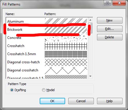 Hi, I would appreciate some advice on fill patterns. I work in the UK, and the detail component ‘Brick’ has a 45 degree single line fill pattern – which is not correct for the UK. The UK uses 45 degree double line fill pattern for brickwork, in a new project (UK Metric) you’ll see this pattern listed as drafting pattern called “Brickwork”. I want to change the family, but when I create a new family using ‘Metric Detail Component.rtf’ , the brickwork pattern is not loaded. (Though there is one called ‘Steel’ which is almost the same). Whist I could rename ‘Steel’ to brickwork, I would really like to know how to create Brickwork properly. It doesn’t look like it can be created as a Simple hatch pattern, when I click on ‘Custom’ and find “revit metric.pat” I cannot see Brickwork when I load the pat file. I know Brickwork exists in the pat file as I can see it when I look at it in Notepad. Any points on what I’m doing wrong? Cheers.