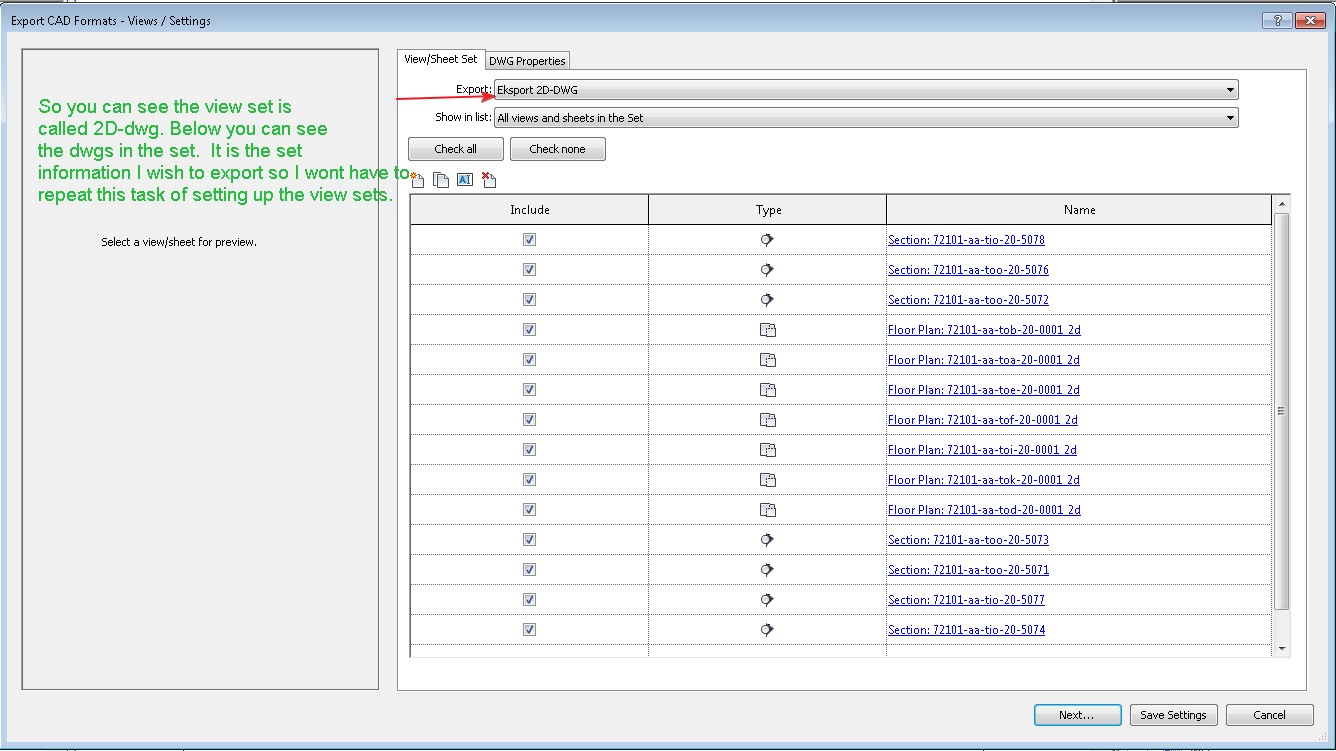 Hi guys, We are trying to transfer all project information across to another project and we have a small problem. We want to save the time of setting up all the view sets with export dwg. (pic attached) Is this possible? Thanks in advance, Mick
