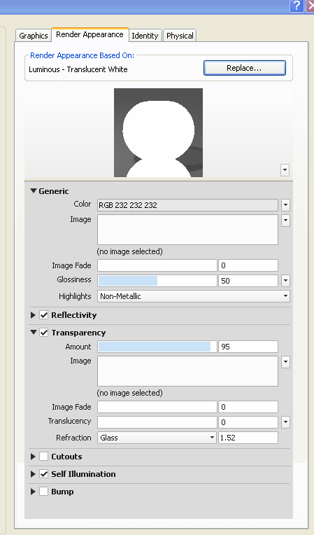 I hav eread a bunch of threads regarding this issue, but whenI go to the material dialoge box for my glass, and go to the rendered apperance tab, the only opptions I have avalable to me ar ethe following: Settings/Materials/Glass (Material Class)/Glass (Actual Material Name) Rendered Apperance: Solid Glass Properties: 1. Color (transmittance) 2. Reflectance 3. Index of Refraction 4. Roughness 5. Bump Pattern Thats all I have access to, I still do not knwo where to find Opacity? Pls I need help..hahahaha